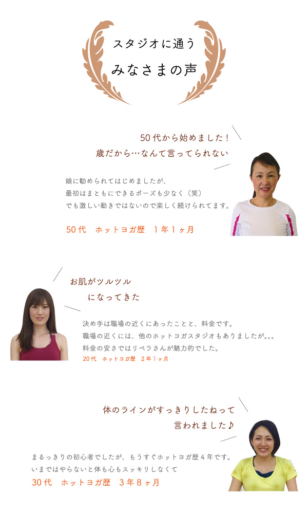 ホットヨガをやってみたいけど、毎月の費用が高くて行けないというご意見から、より多くの人にホットヨガを体験して欲しいという想いでスタジオリベラでは東海地区最安値の料金プランを宣言!月額 5,000円(税込5,500円)~の3プランをご用意しております。お客様のライフワークにあわせてプランをお選び頂けます。もう一つの特徴は選択された料金プランはずっと同じ料金。だからはじめの数ヶ月のみ安くて後から料金が上がってびっくりするなんてこともございません。
